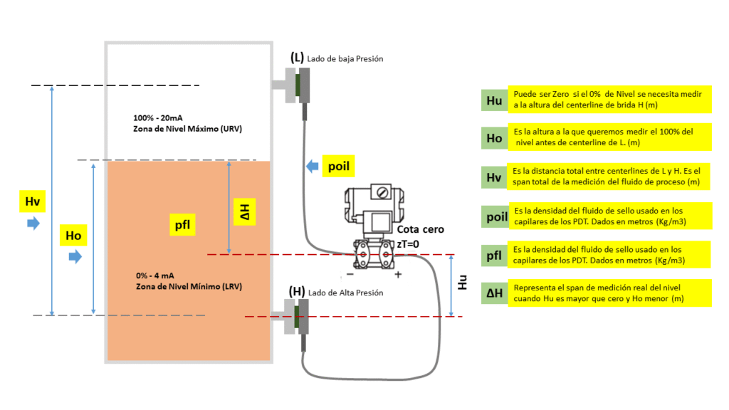 Cálculo de LRV, URV y Span con Ho, Hu, Hv; ρfl (proceso), ρoil (sello) y g.